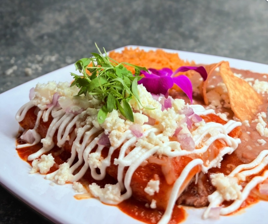 Choose between red or green enchiladas with red onion, queso fresco, and sour cream. Includes refried beans and country potatoes. Asada, chicken, or cheese.